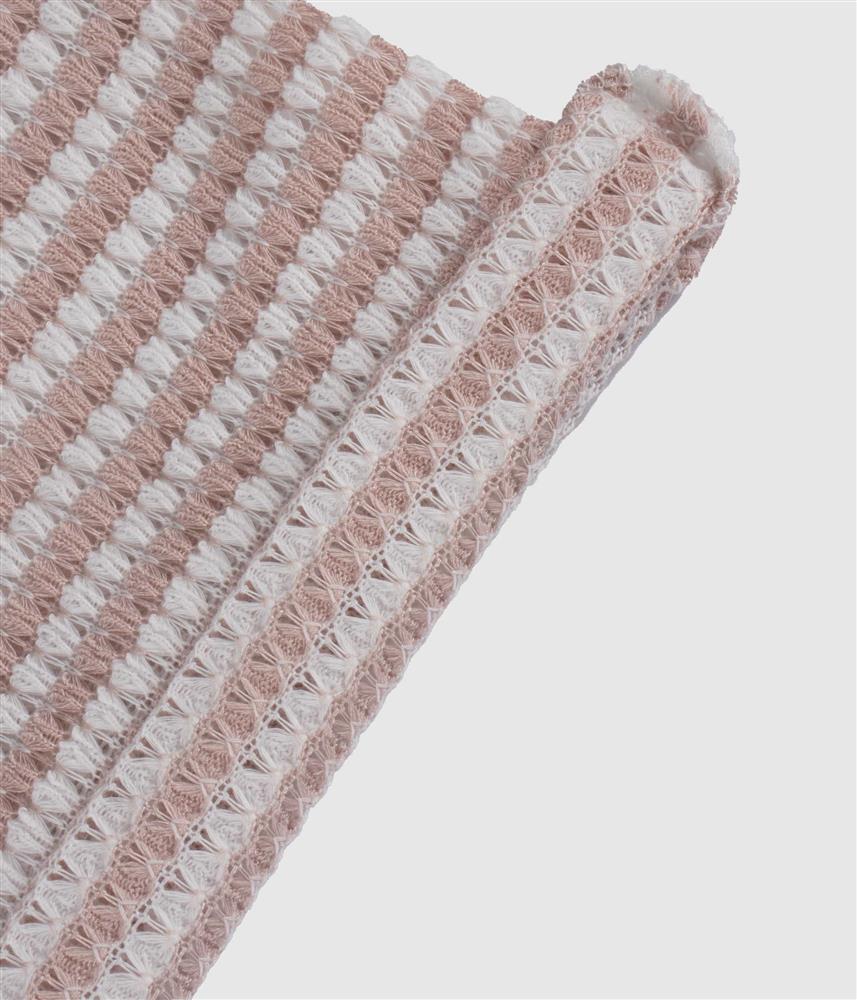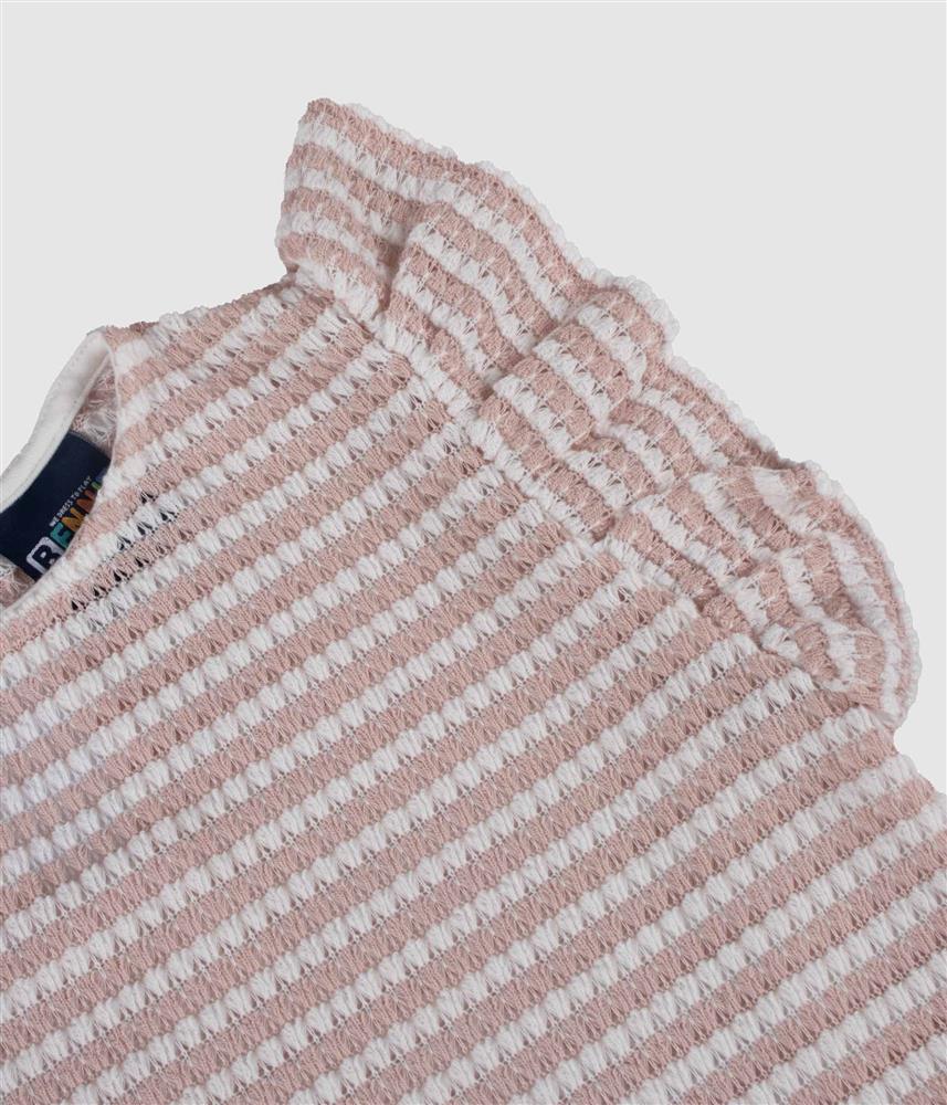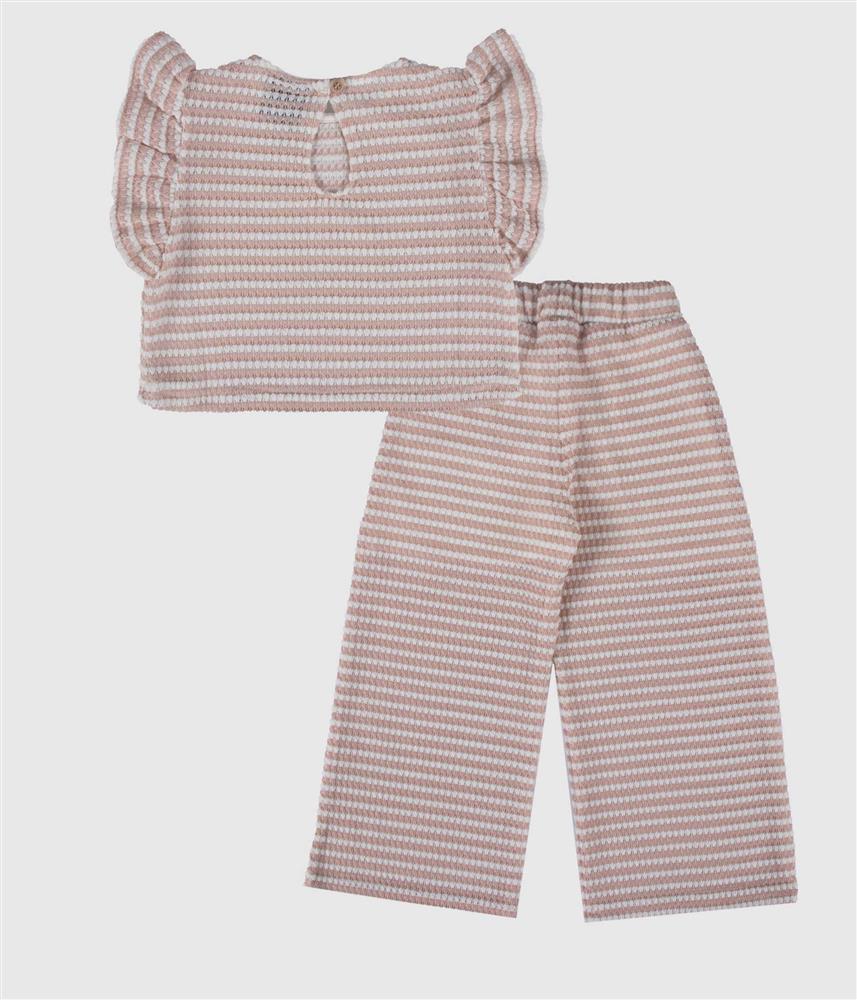 Este conjunto de duas peças destaca-se pela sua malha trabalhada, tipo tricot, que oferece um toque macio e um visual sofisticado. A blusa apresenta um padrão de riscas horizontais delicadas e pormenores de folhos nos ombros, conferindo um ar romântico e feminino. A calça de corte reto e fluido garante total liberdade de movimentos, mantendo o máximo conforto graças ao elástico na cintura. É a escolha ideal para quem procura um look coordenado, elegante e muito confortável.