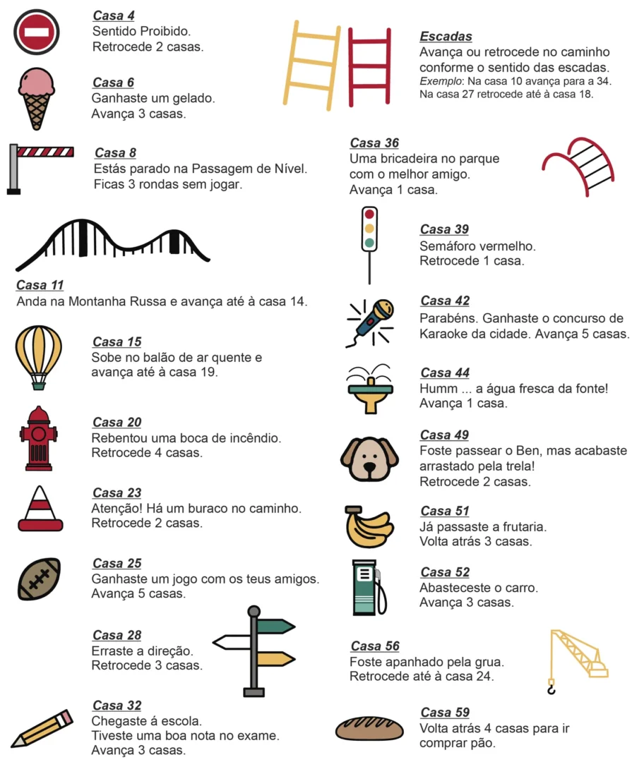 2. Pela ordem estabelecida, cada jogador lança o dado alternadamente e vai avançando no tabuleiro o número de casas indicado pelo dado, seguindo as indicações lá presentes.