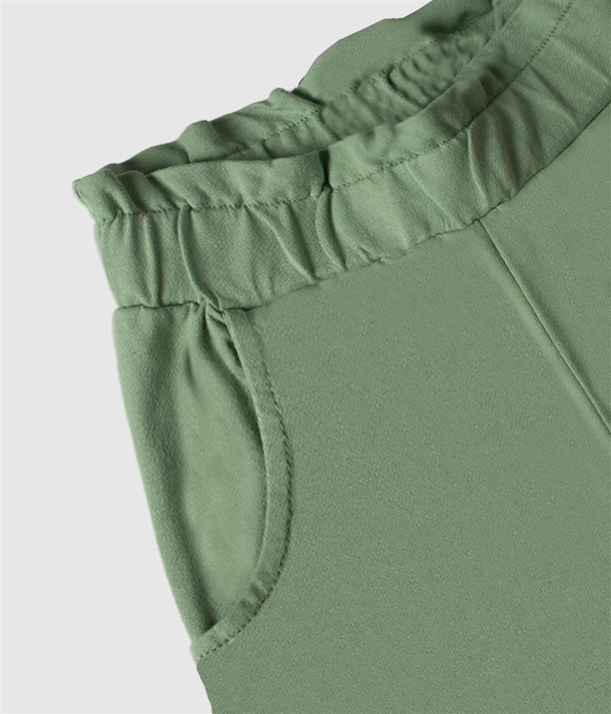Cintura com elástico, que garante melhor ajuste e comodidade, criando um efeito franzido com folho na parte superior. Incluem bolsos frontais práticos.