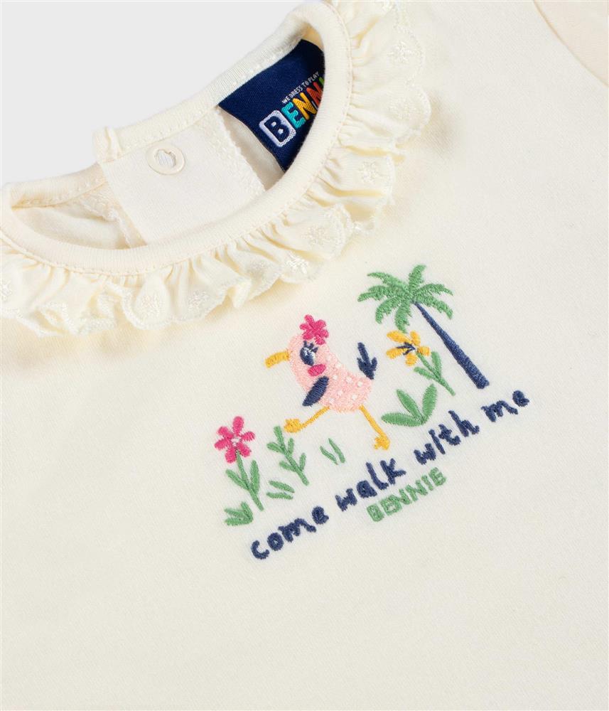 Camisola em jersey fresco e macio, perfeita para combinar com a tua peça da parte de baixo favorita, pelas suas extermidades ternurentas e bordado minucioso.