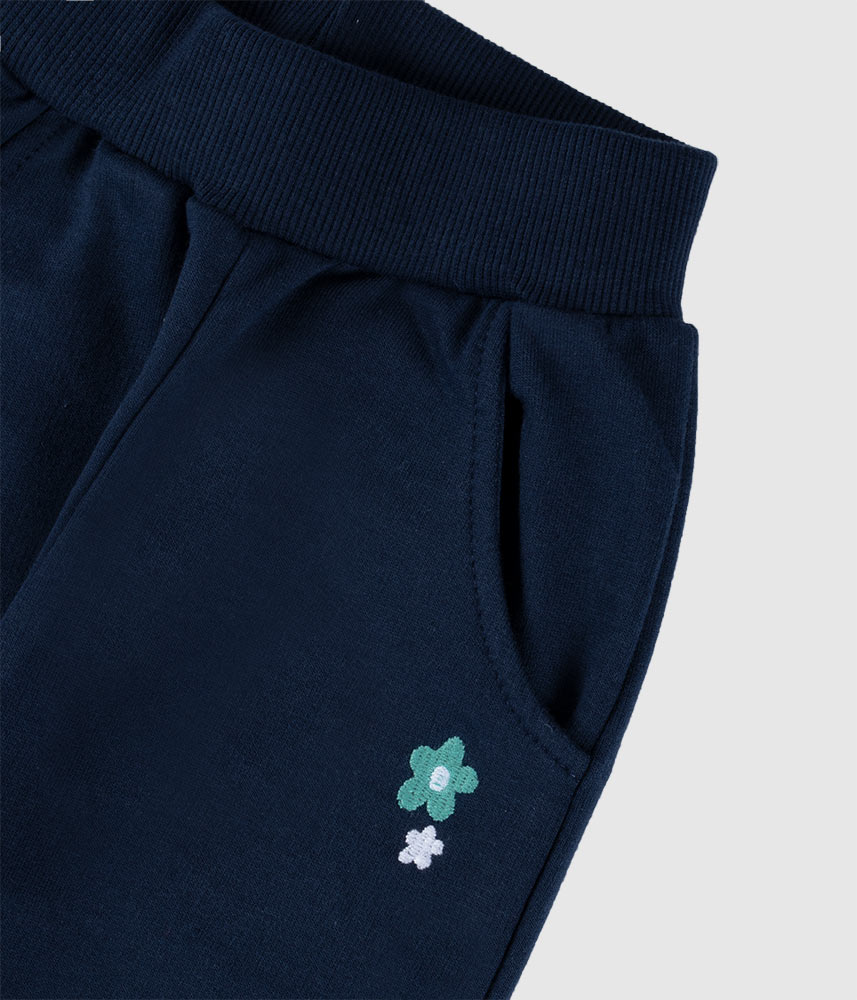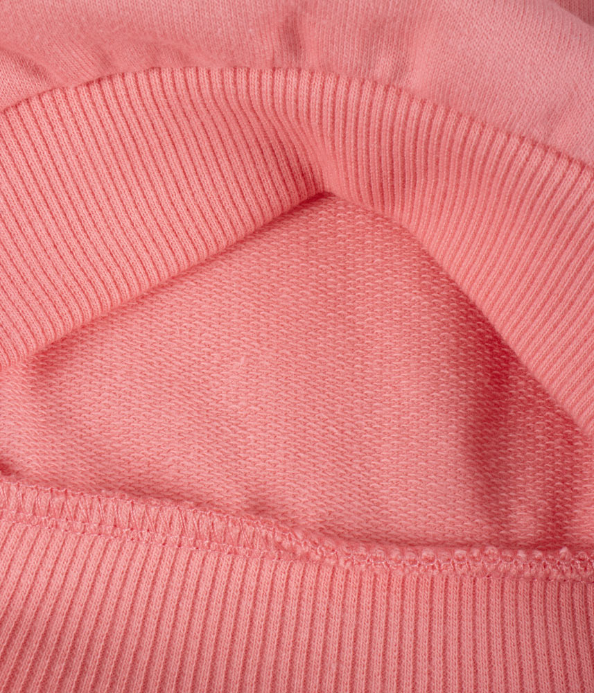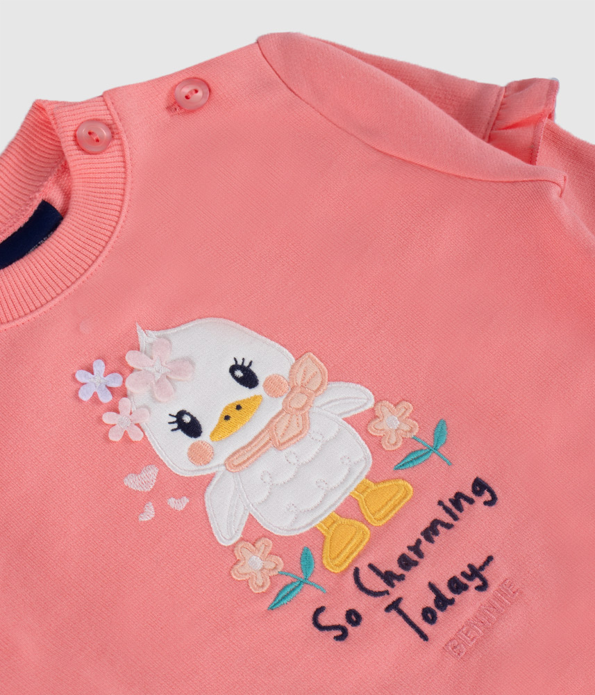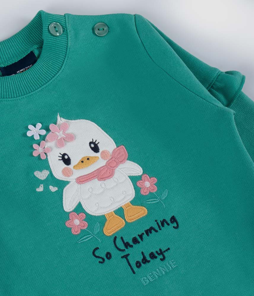 O bordado na frente da sweatshirt é mimoso e colorido. Os pormenores em feltro dão um toque delicado à peça. Os folhos nas mangas dão estilo.