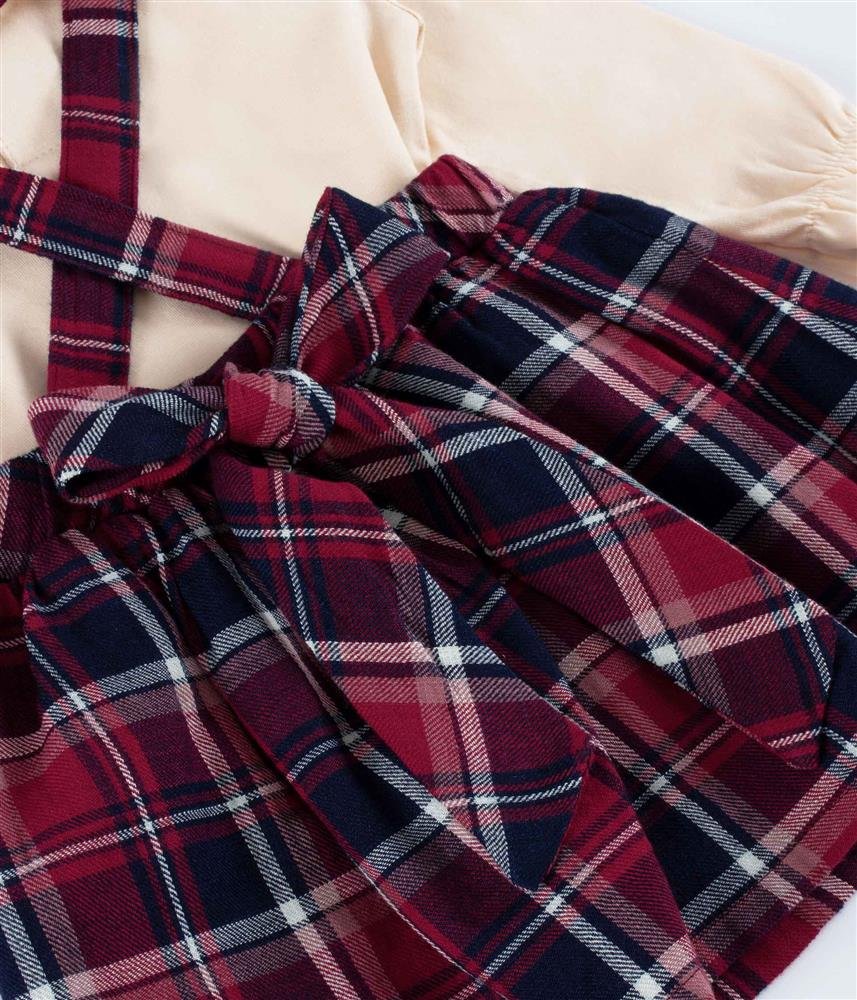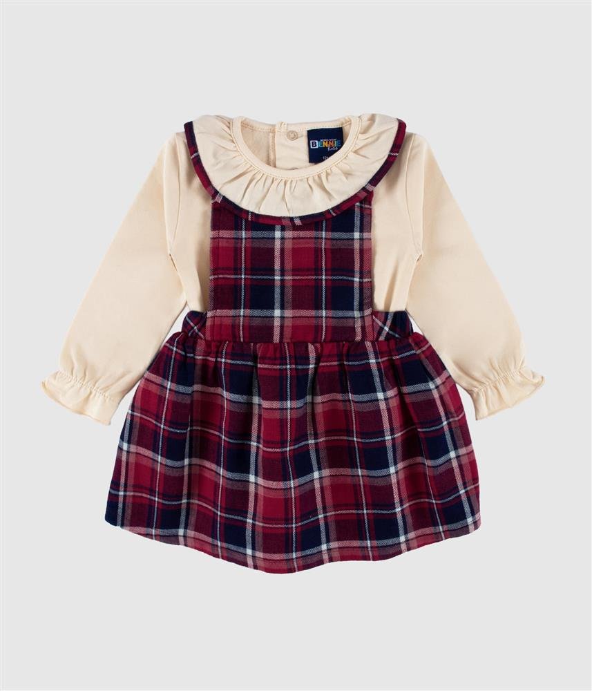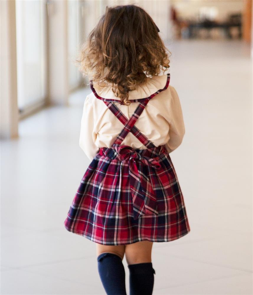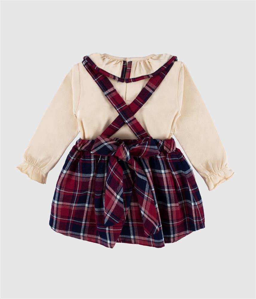 O Vestido em xadrez, cruza na costa, fechando com botões.