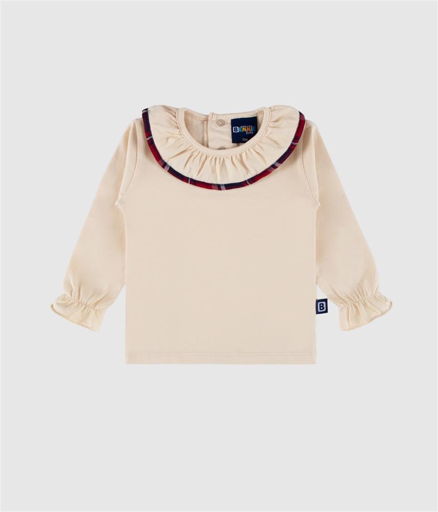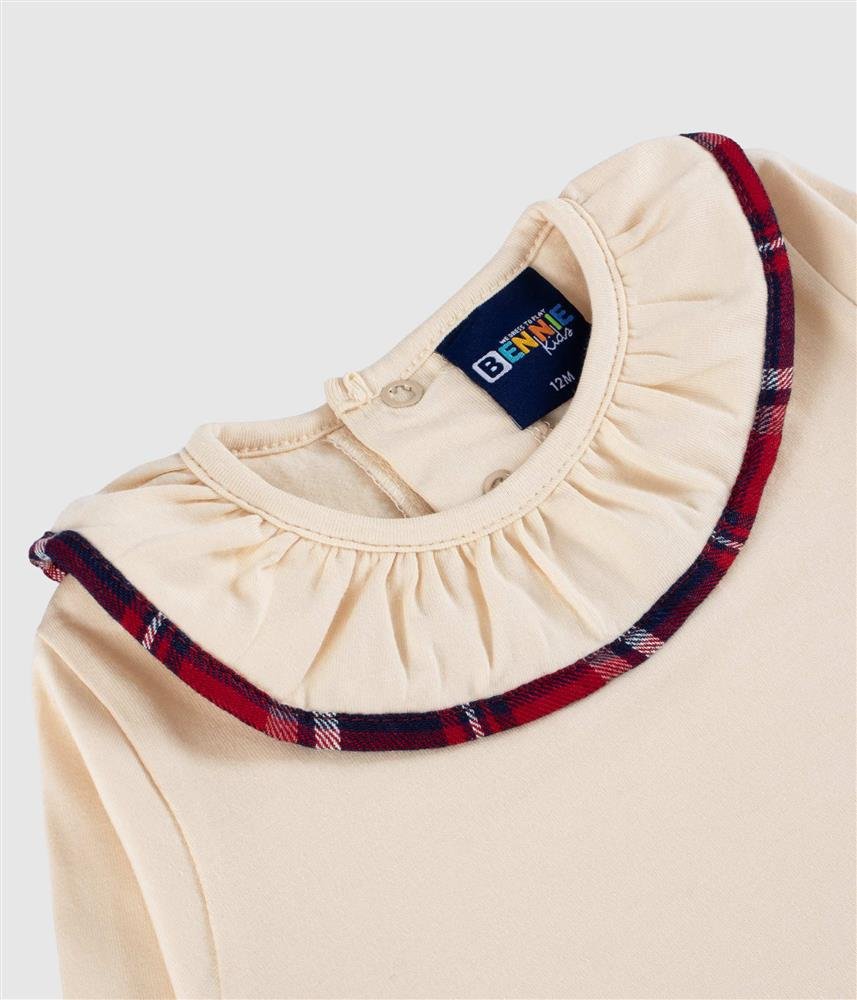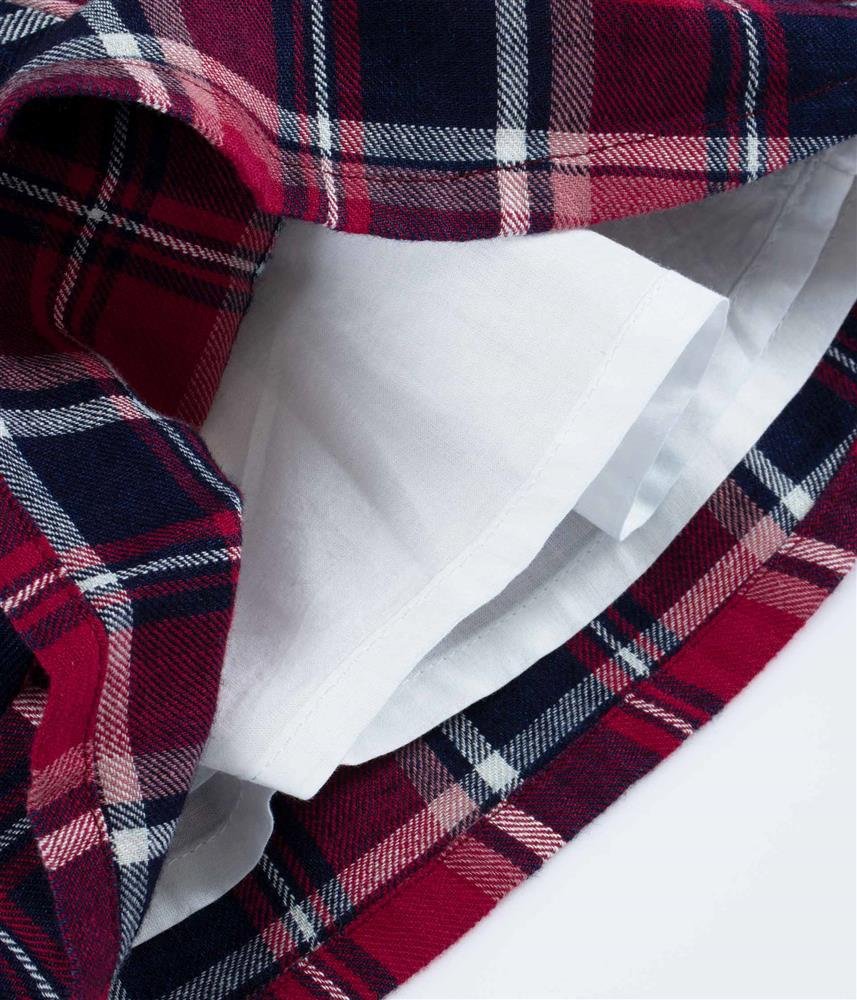 A camisola apresenta um folho com extremidade bordada a xadrez e punhos com elástico, para um toque mais feminino.