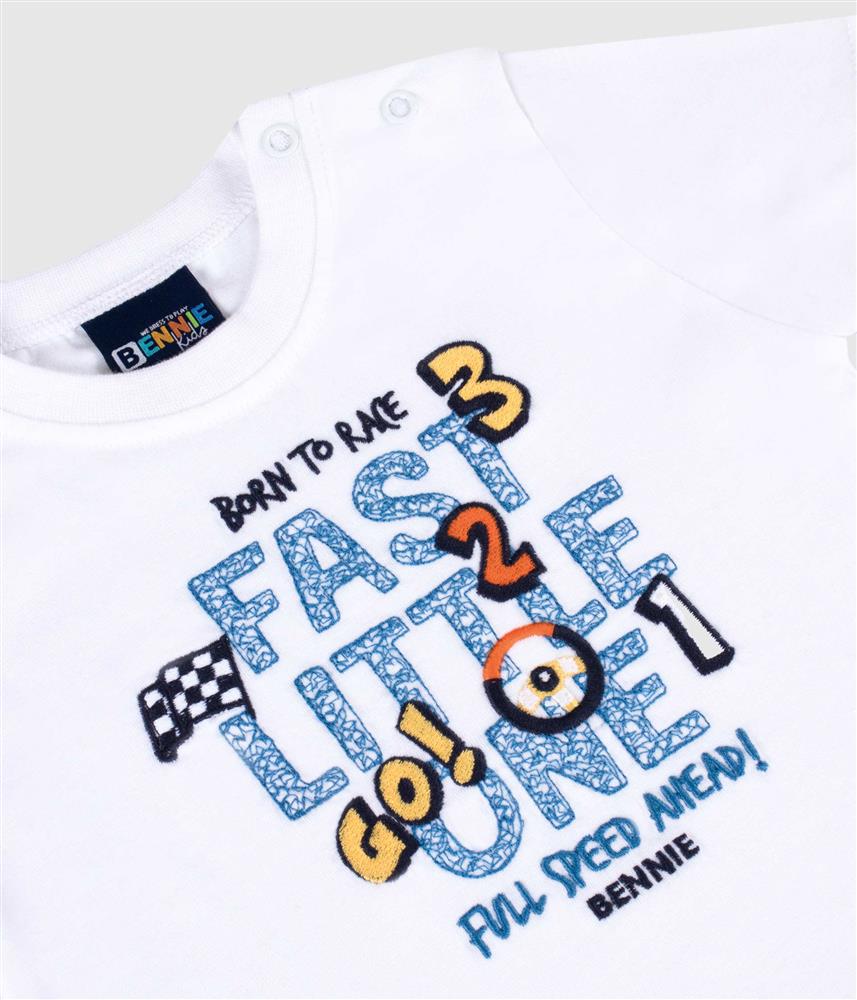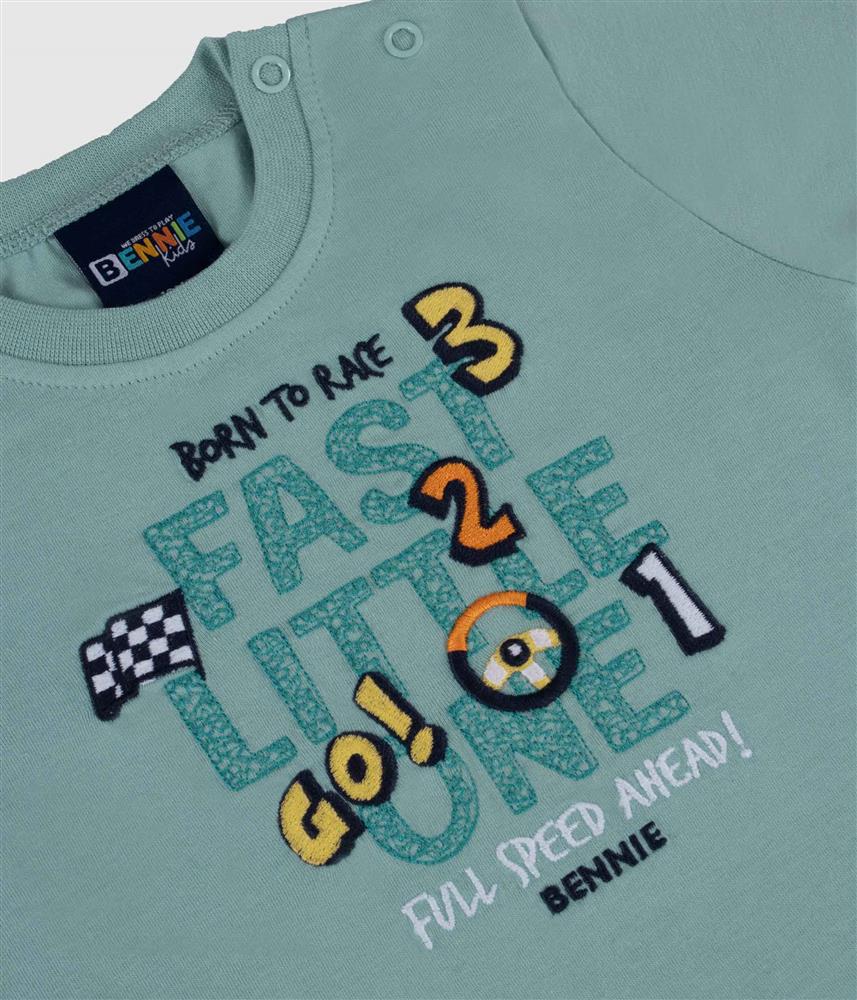 Este conjunto de duas peças, fabricada em jersey de algodão leve e macio, é a escolha perfeita para os pequenos fãs de velocidade. A t-shirt, , destaca-se pelo estampado frontal “Fast Little One” com detalhes gráficos de competição e cores vibrantes. Os calções garantem a máxima liberdade de movimentos e conforto para o dia a dia, contando com um elástico prático na cintura e bolsos funcionais. Um look moderno, desportivo e cheio de personalidade para as estações de Primavera e Verão.
