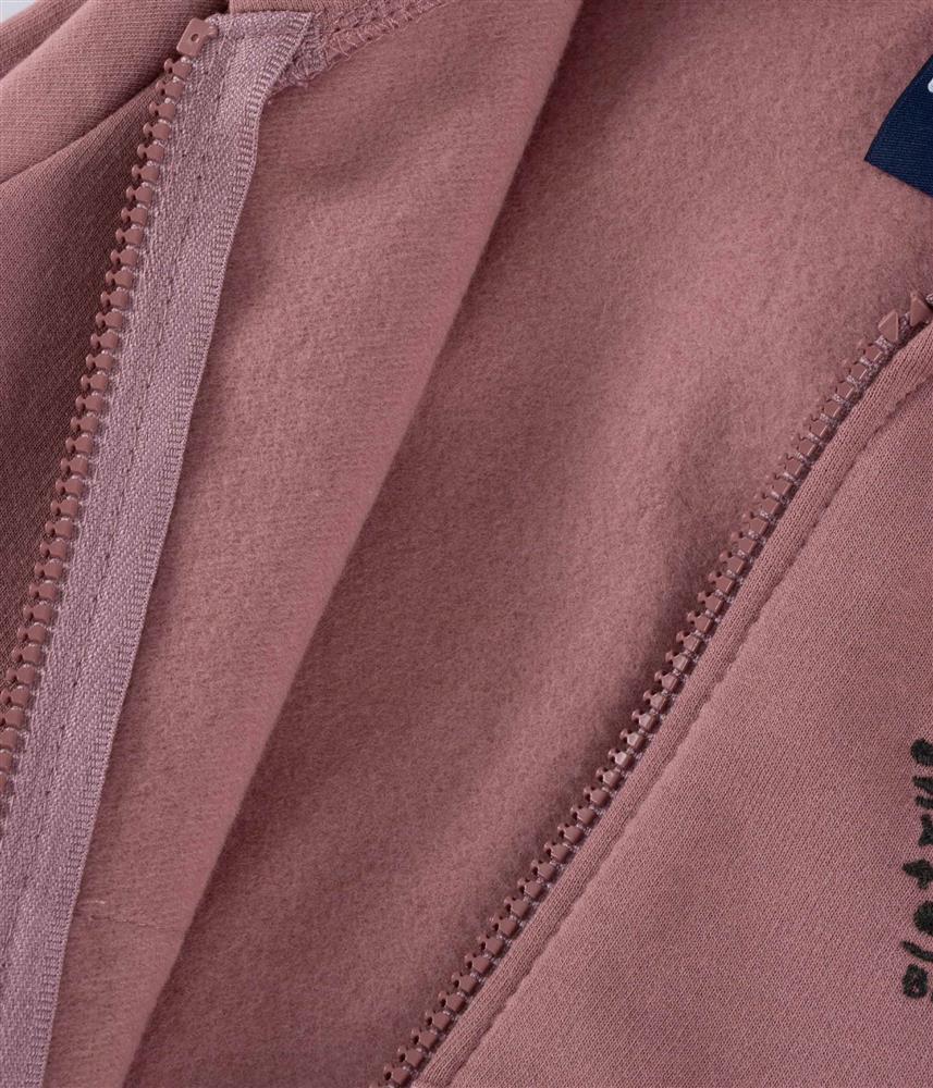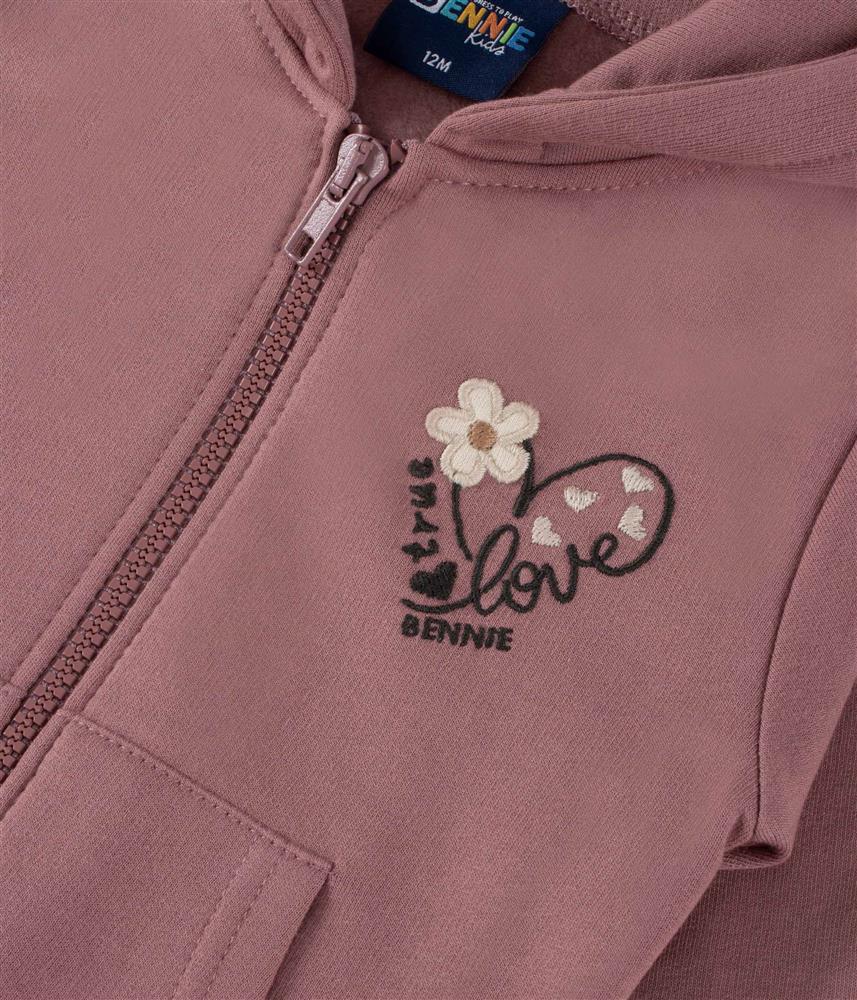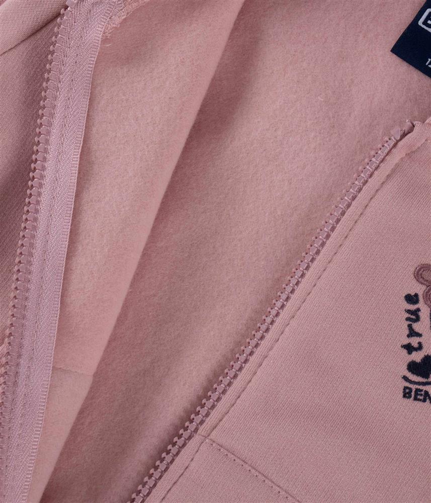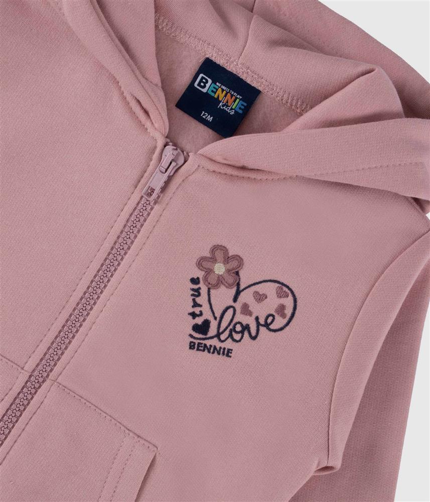 Na frente do casaco um fecho central e bolsos que tornam a peça prática e confortável. O bordado do peito é discreto e amoroso.