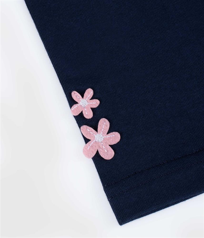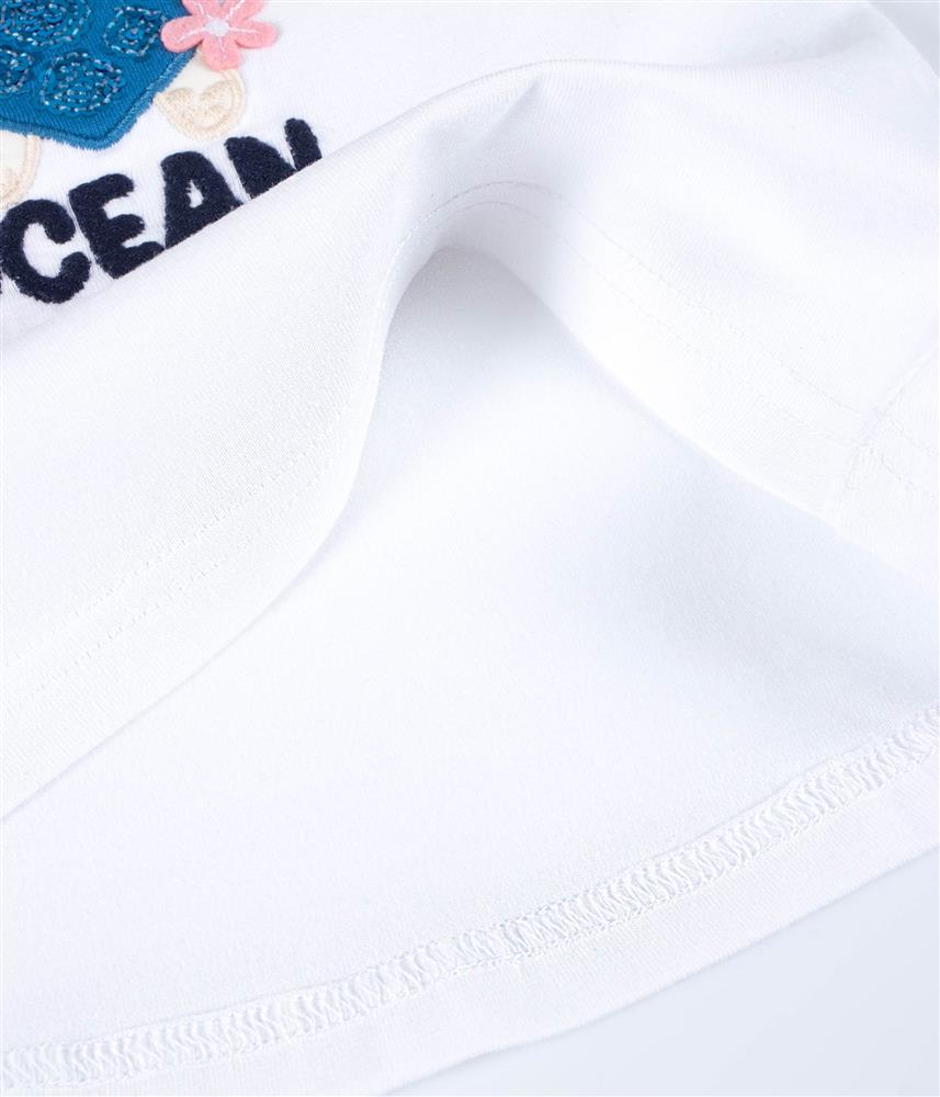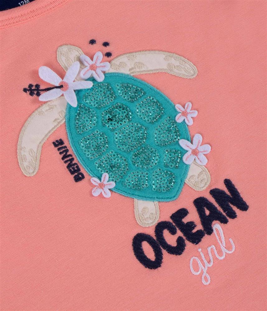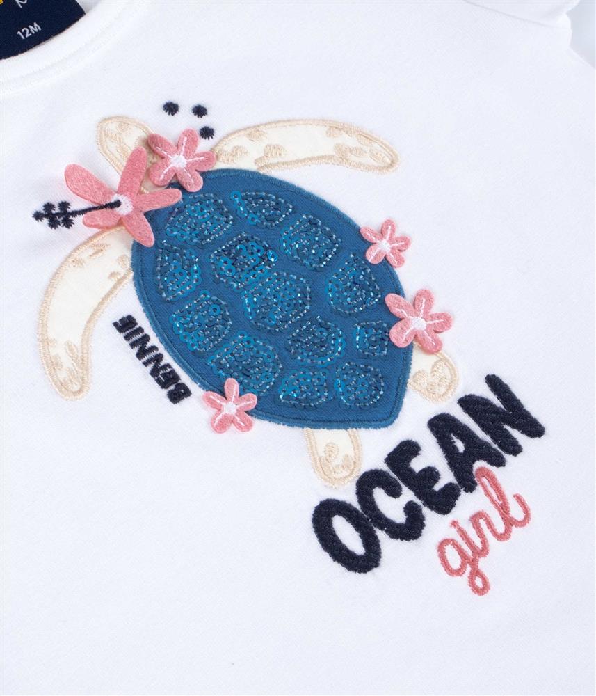 A t-shirt bordada na frente com uma tartaruga, tem pormenores em feltro e lantejoulas, que tornam cada peça única e especial, com o toque de brilho que elas tanto adoram!