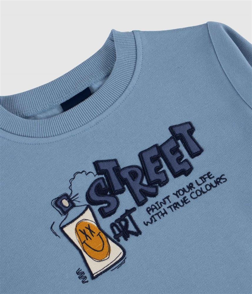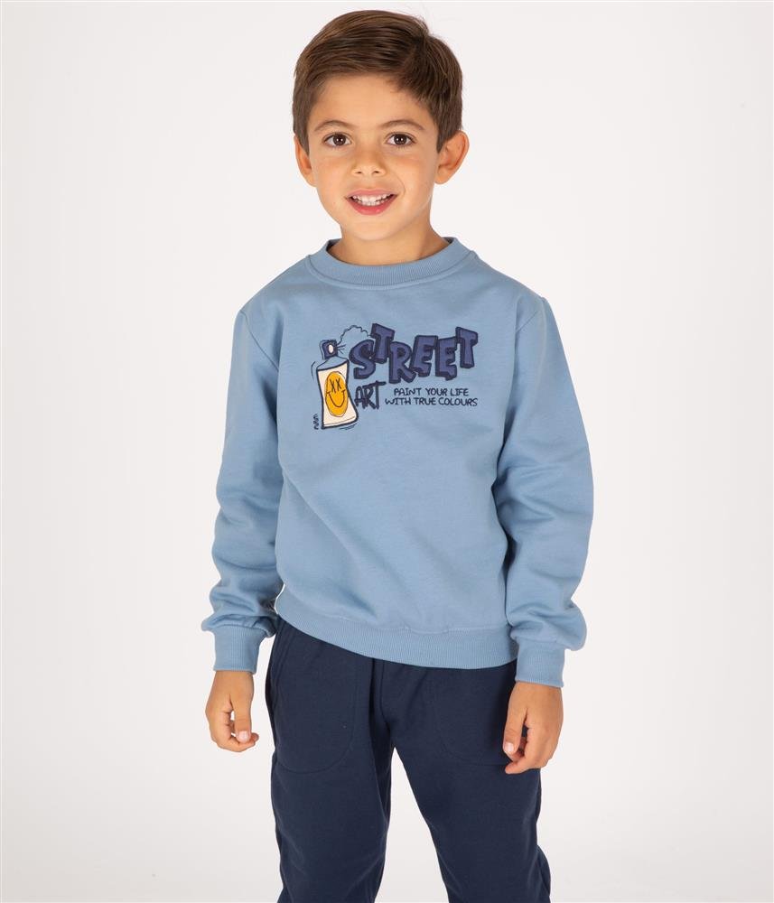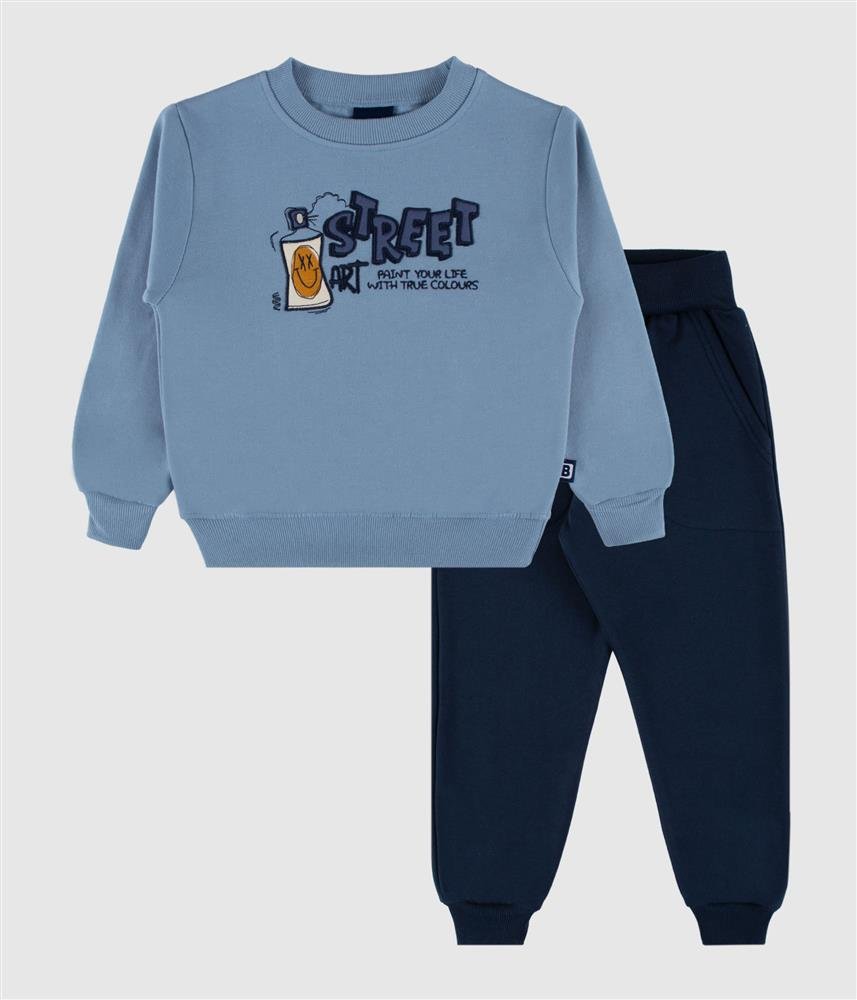 O estilo sai à rua com um conjunto colorido e animado… composto por sweatshirt e calça, em felpa cardada.
