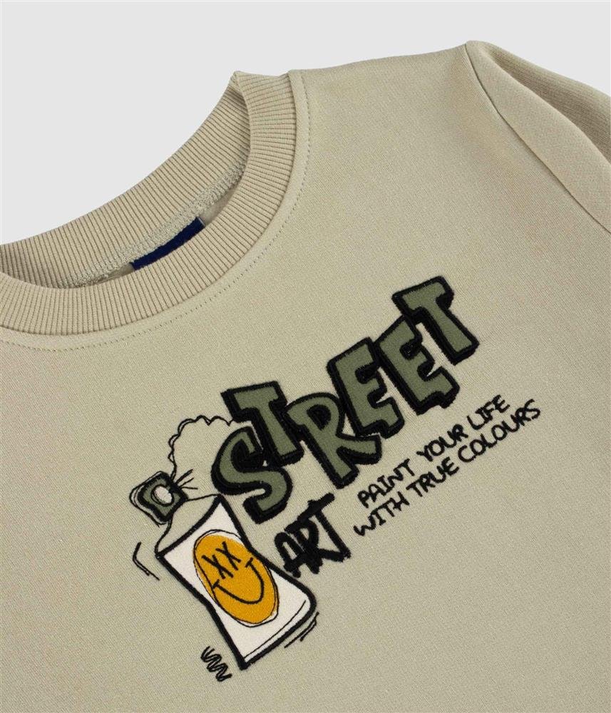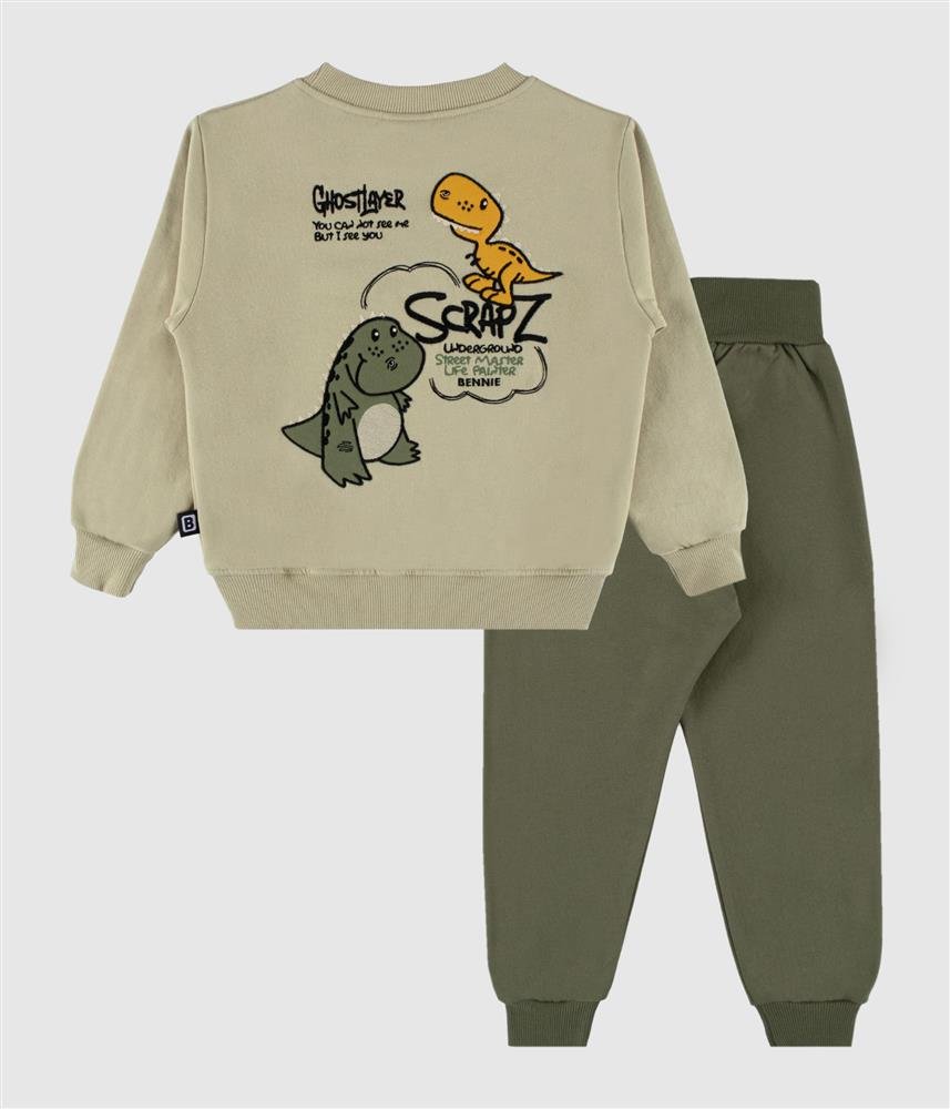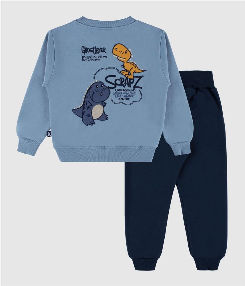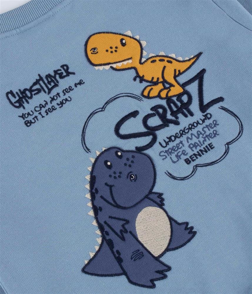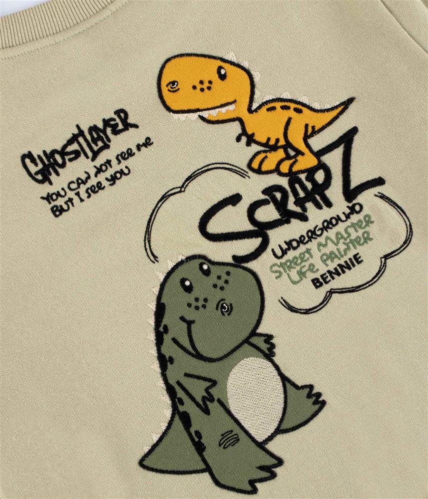 Na frente da sweatshirt, um pequeno bordado atraente e carismático… Atrás, o bordado vistoso e divertido dos dinossauros preenche a costa.