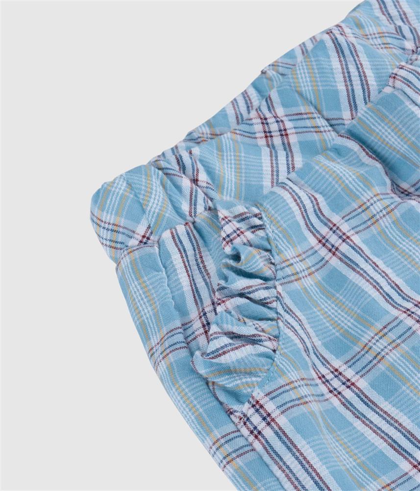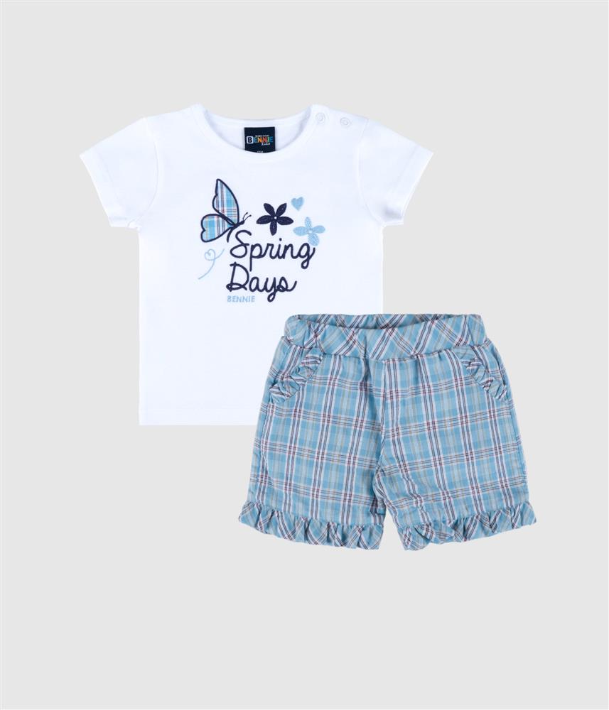Inclui t-shirt de manga curta com bordado delicado e calções em xadrez com folhos, criando um visual doce e fresco.