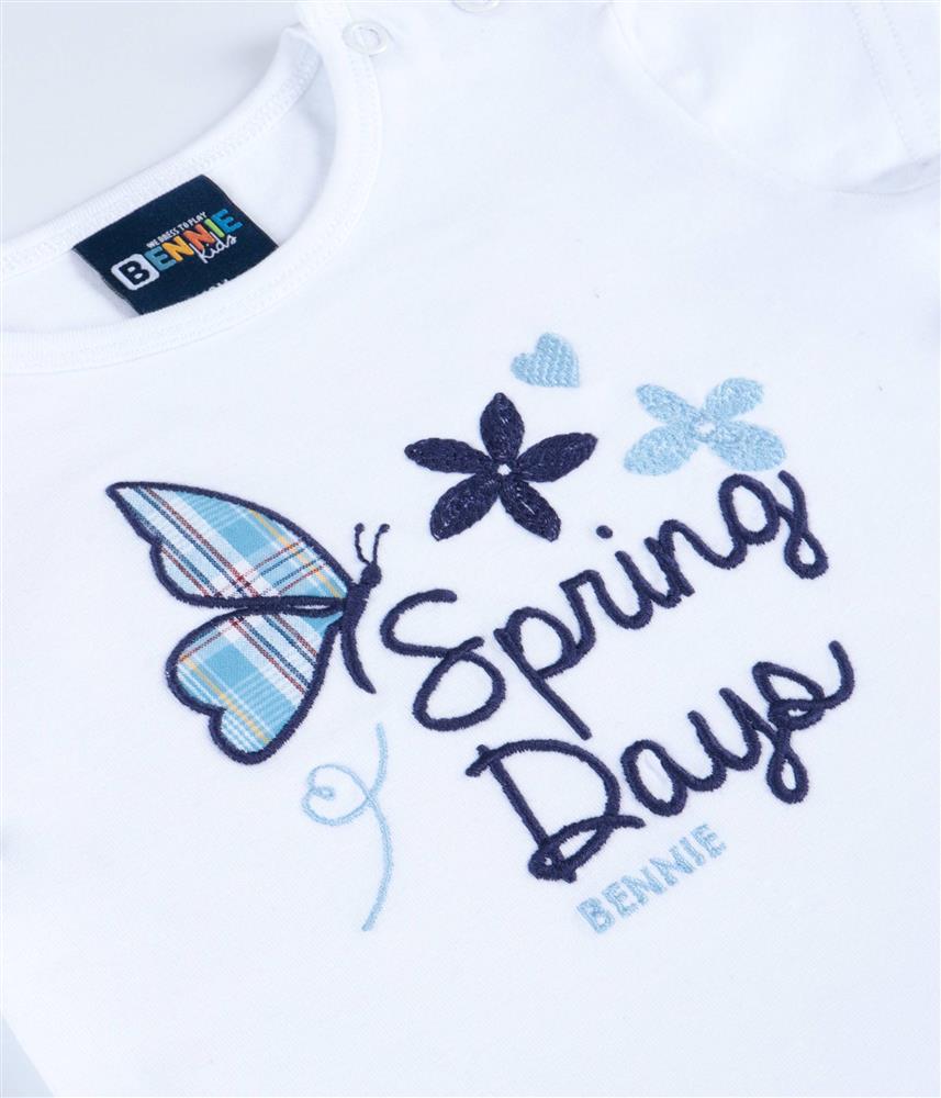Nos tamanhos 12 e 18 meses, a t-shirt possui molas no ombro, facilitando o vestir e despir do bebé.
