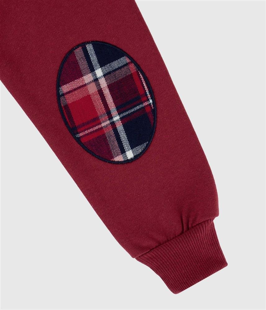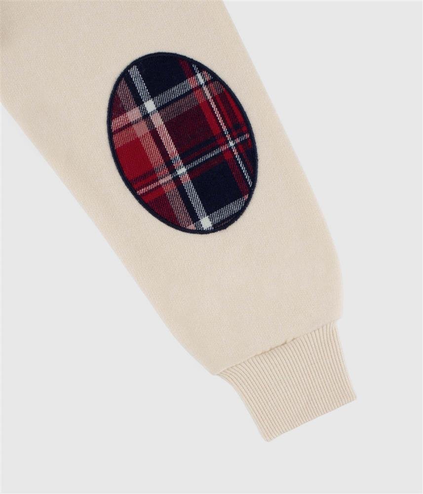 Na frente, um leve bordado sob uma tira de xadrez, com abertura para colocar o cordão.