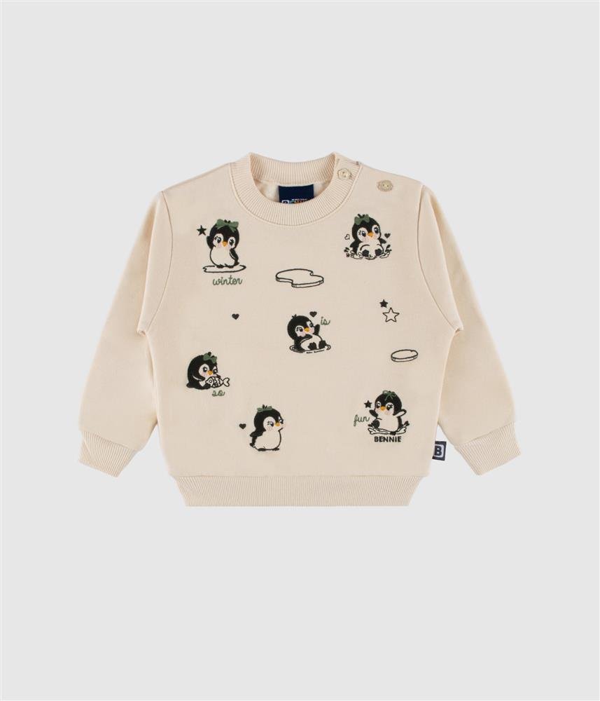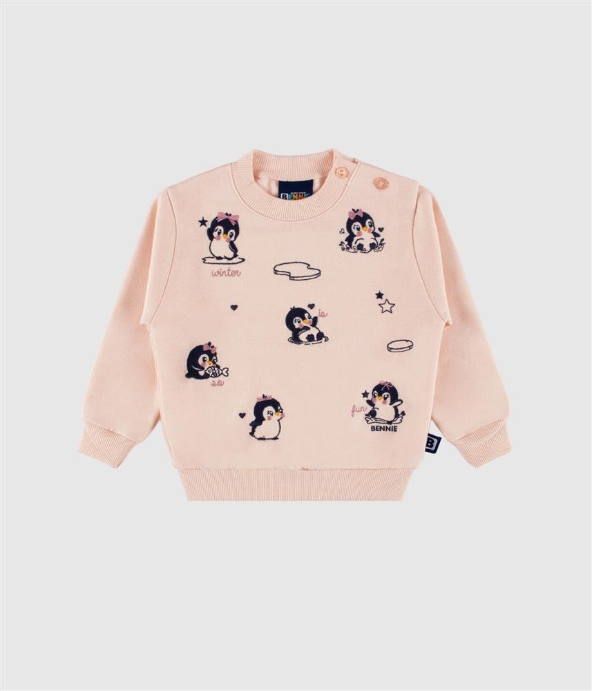 A sweashirt “Fun Winter” apresenta uma combinação bordada de pinguins animados e coloridos. A felpa cardada em tons nude transmite aconchego e permite combinar com diversas cores de leggings ou calças.