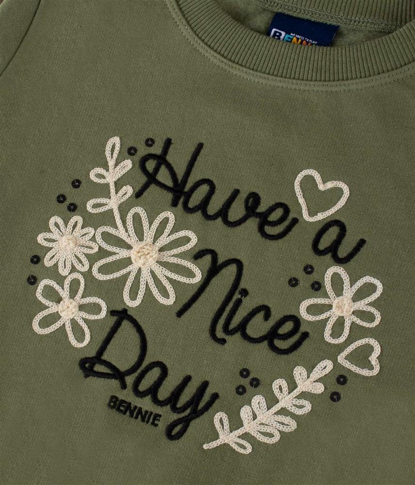 Na frente da sweatshirt um bordado leve e apaixonante com pormenores em lantejoulas.