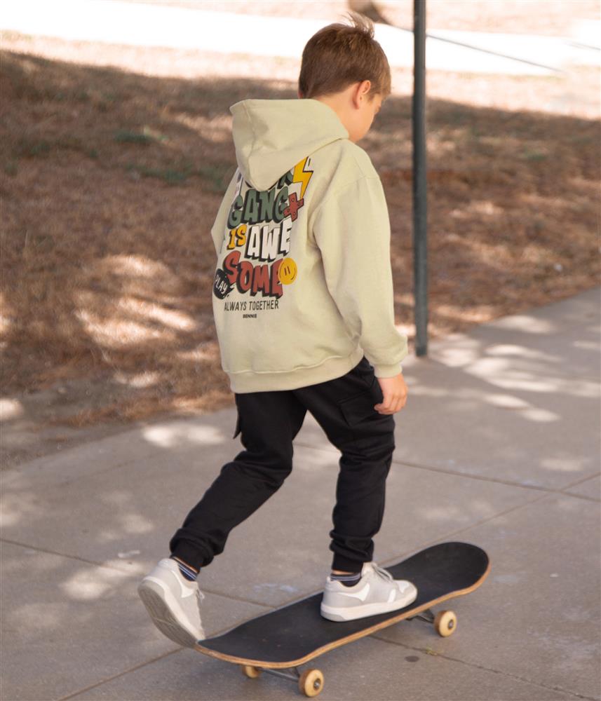 O estampado na frente é divertido e os tons neutros tornam a peça unisexo, o que é perfeito para vestir de igual o casal de irmãos ou primos que não se largam.