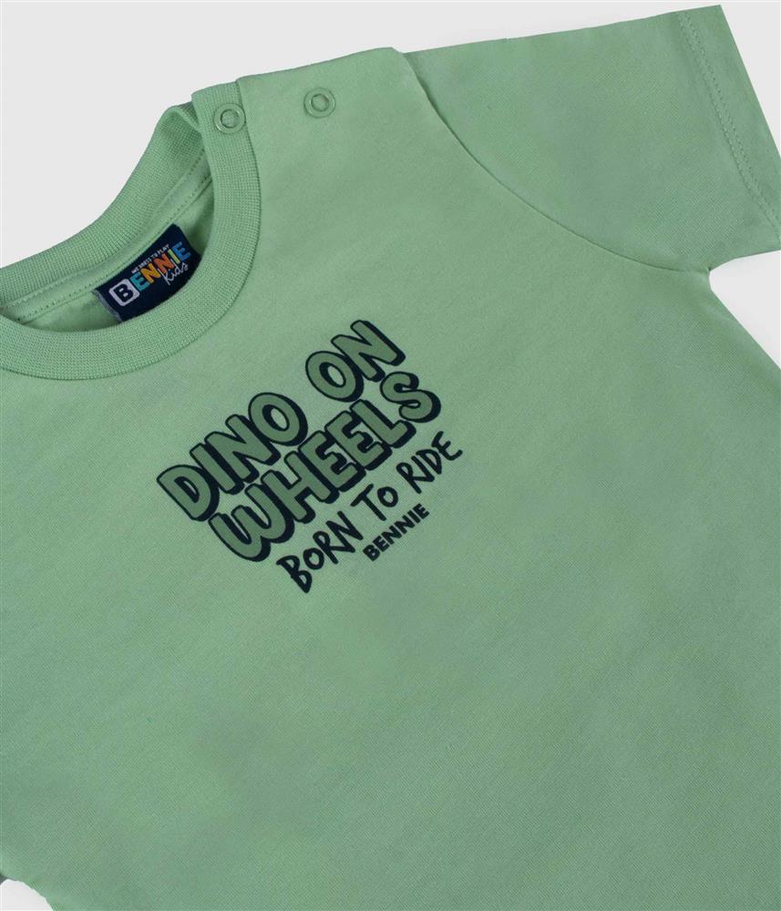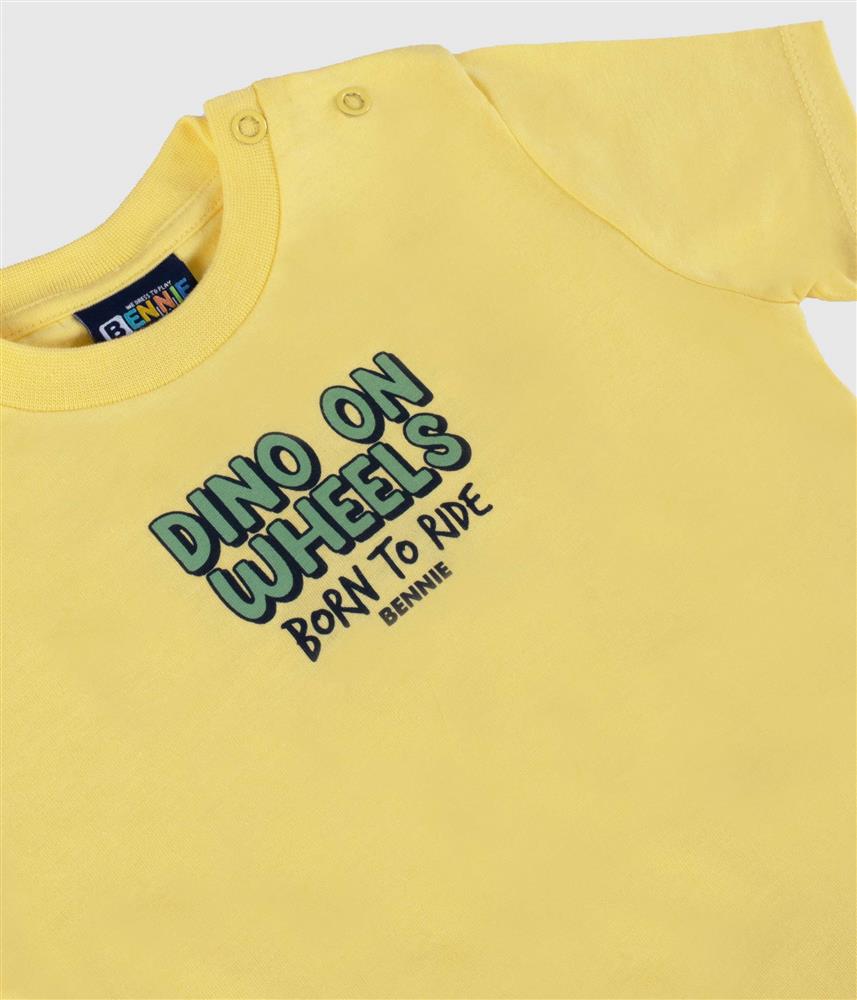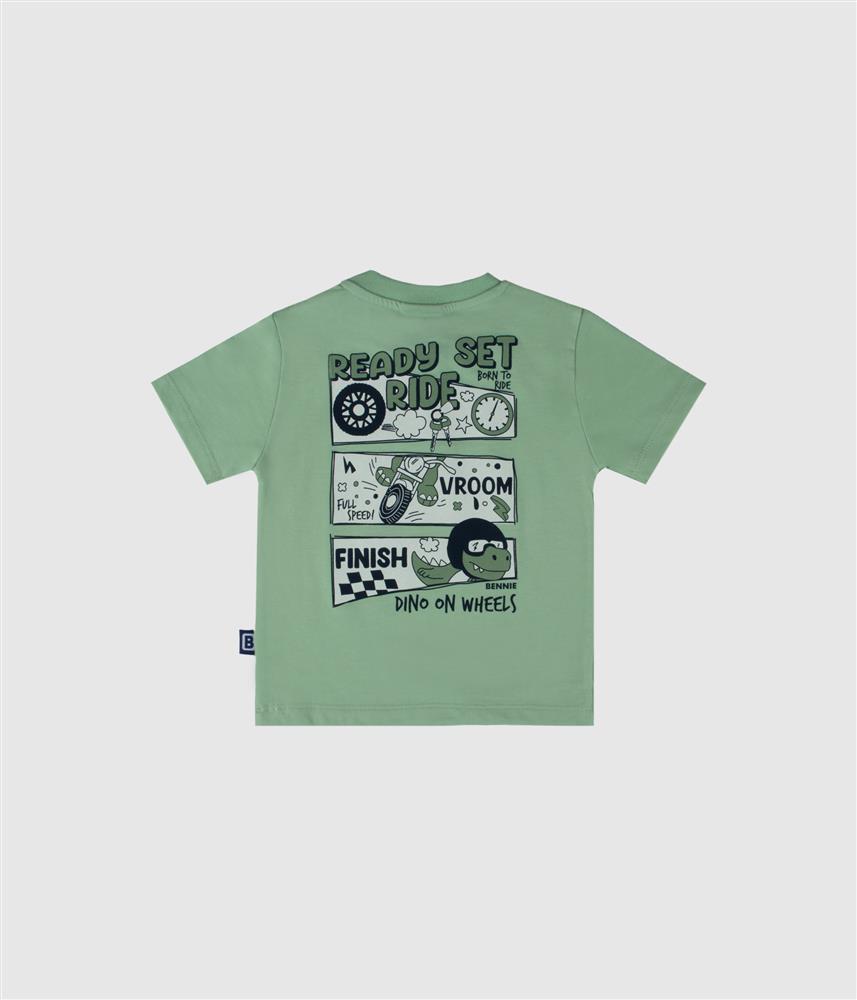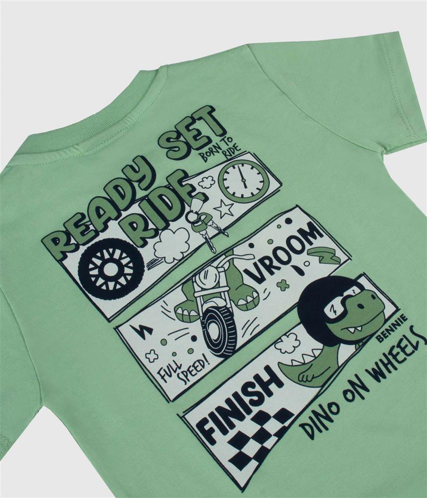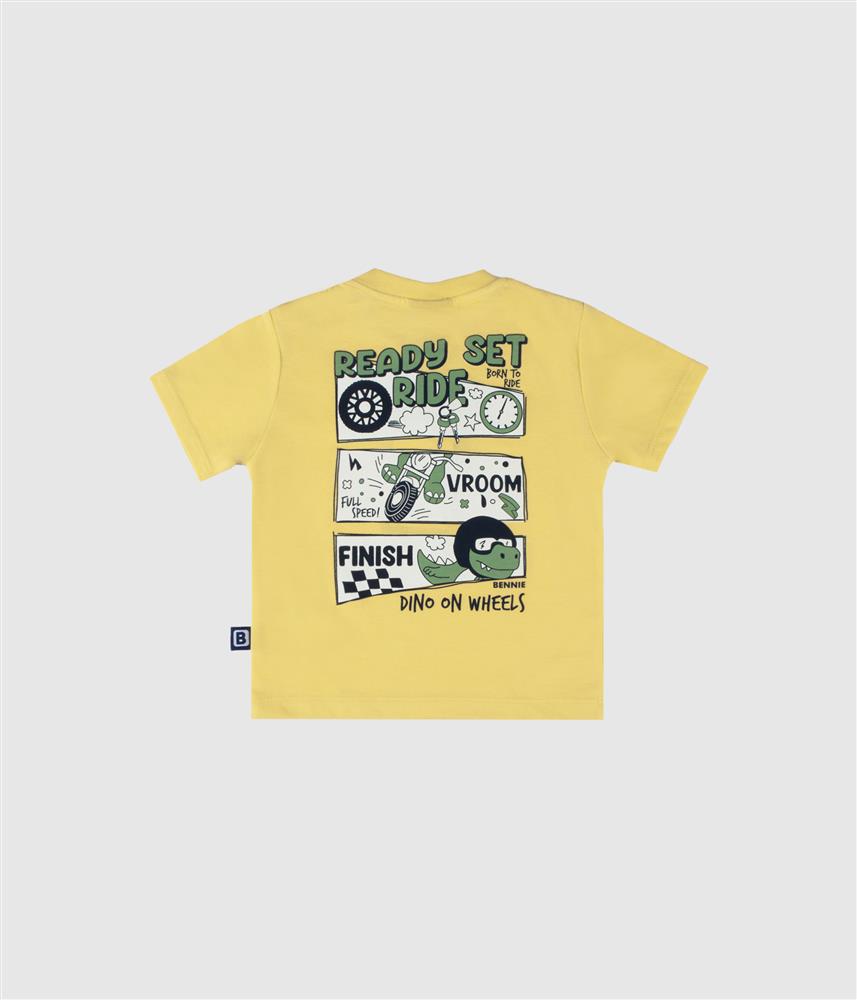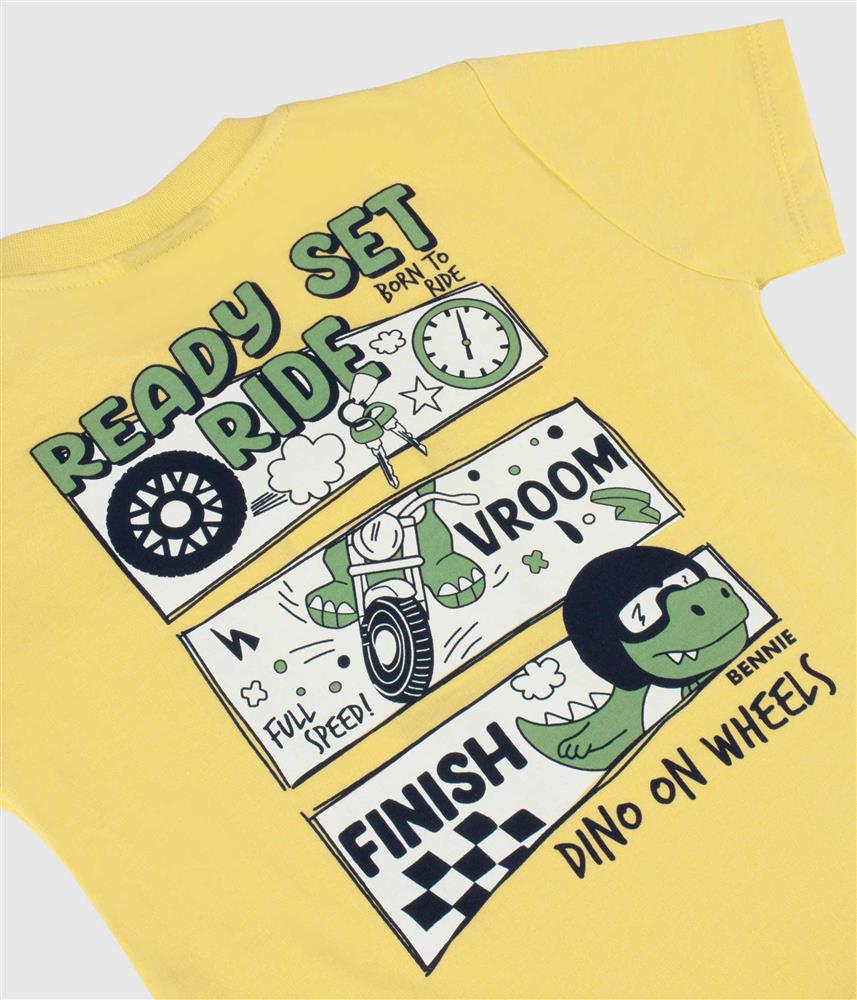T-shirt em jersey leve e macio, com cores vibrantes e alegres. O estampado na frente é simples e discreto.Nas costas, a diversão ganha vida com um estampado colorido e vistoso, estilo banda desenhada, que conta a história de uma corrida pré-histórica: “READY, SET, RIDE”, “VROOM” e “FINISH”, com direito a um dinossauro motociclista de capacete.