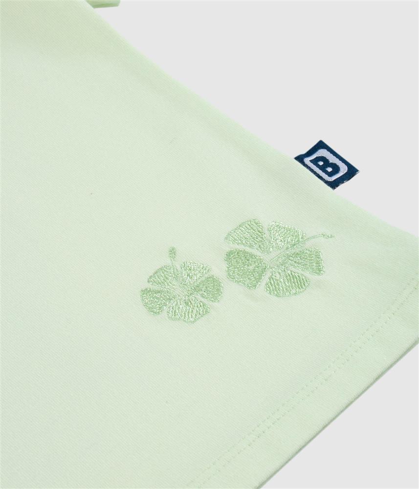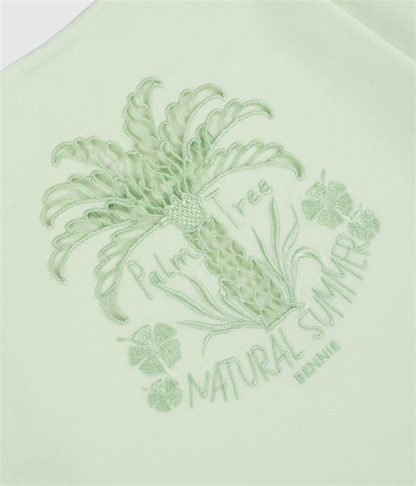 Na frente, um bordado simples à cor. Na costa, um bordado irresistivel, com cortes que criam buracos e formam uma palmeira.