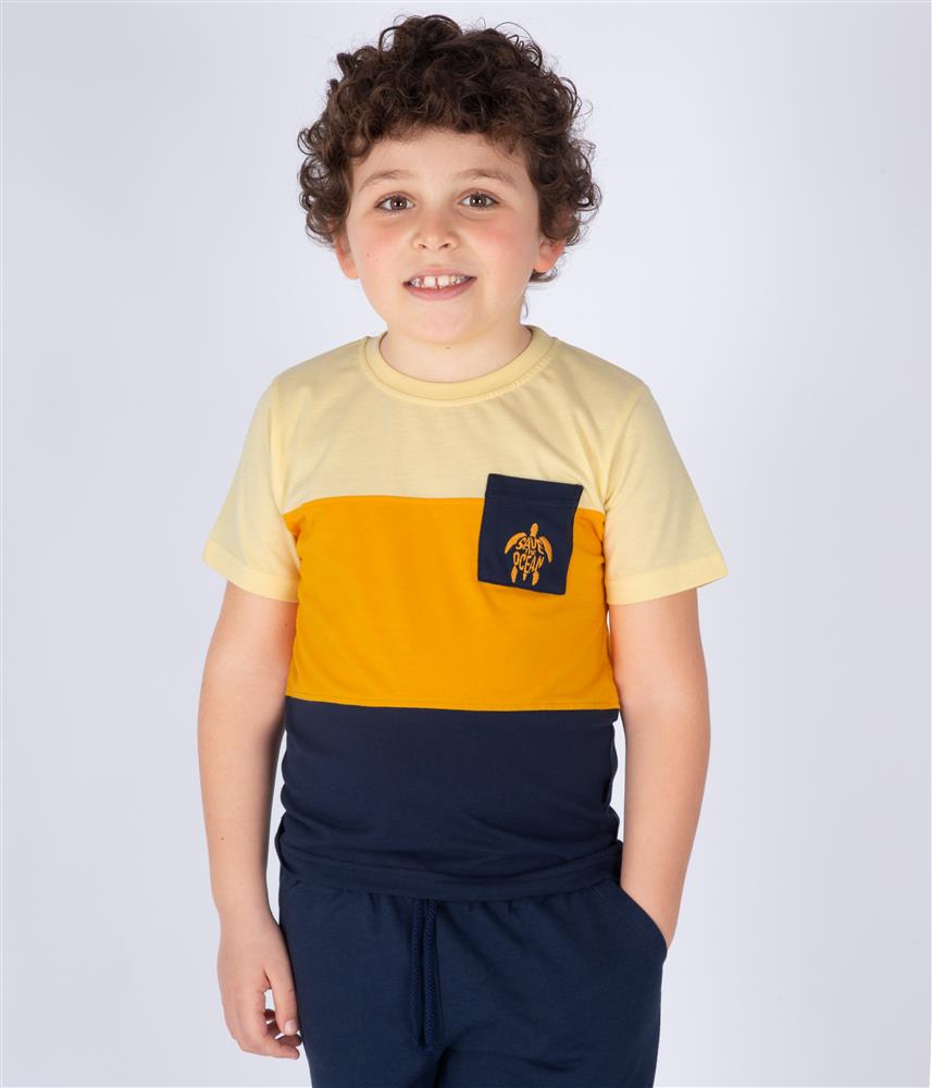 T-shirt em jersey macio e confortável. Com um design estilo “Color Block” nos tons de manteiga, manga e azul-marinho que conferem um estilo moderno e divertido.