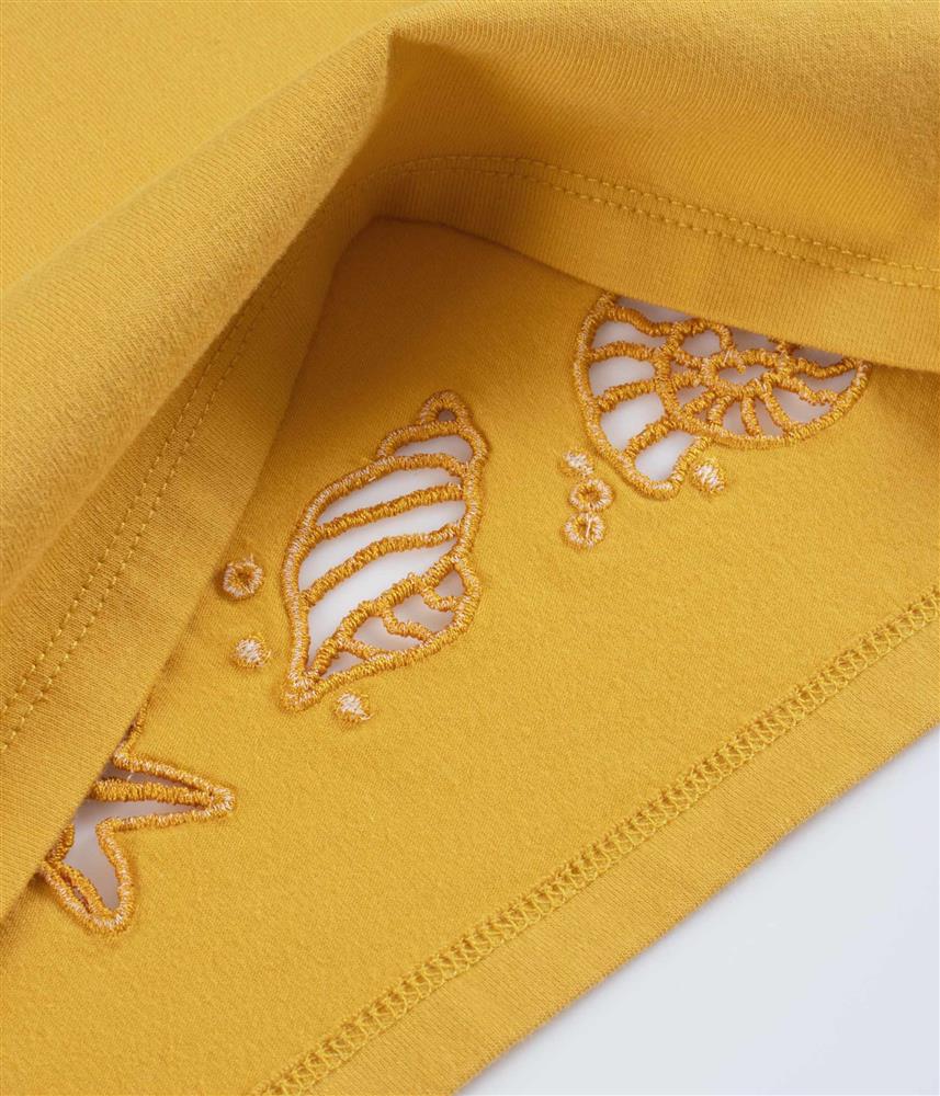 Os bordados na frente e no fundo da costa têm cortes que criam buracos e marcam a diferença na peça.