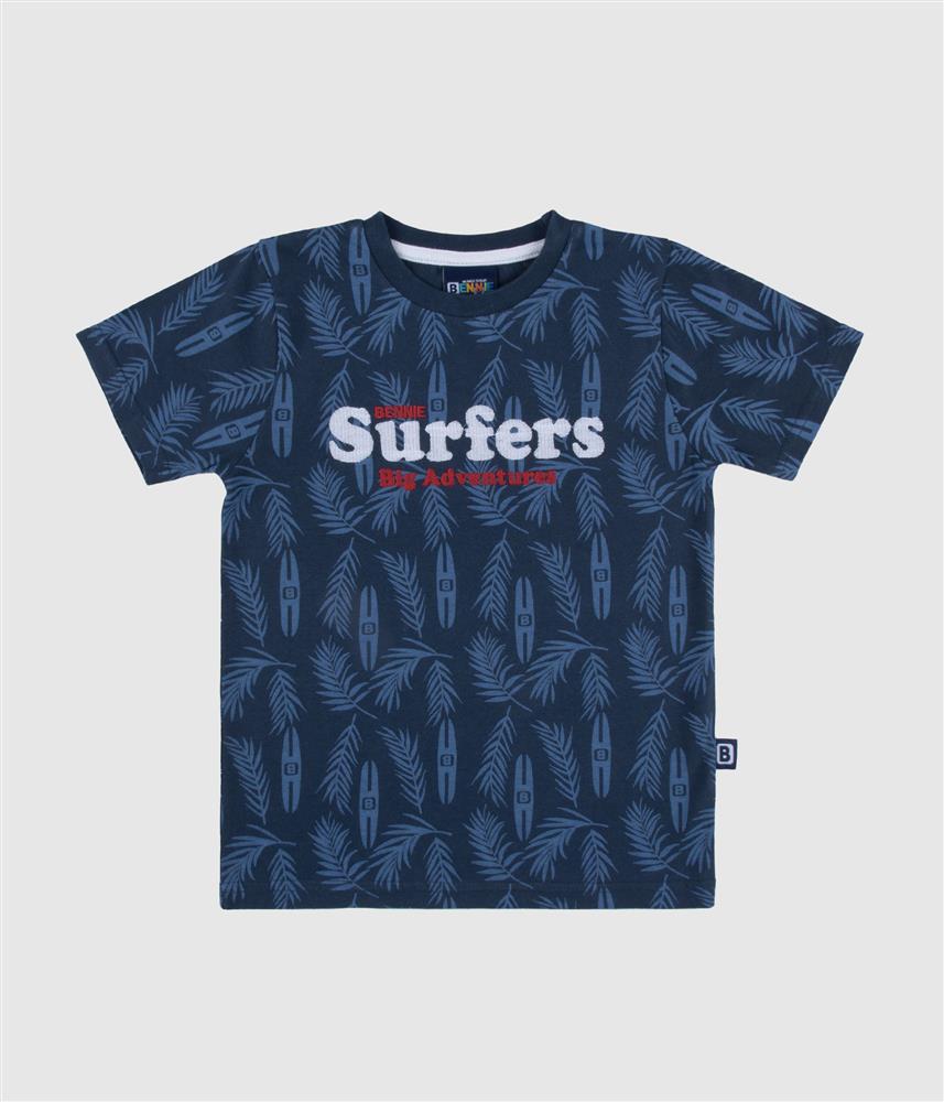 T-shirt em jersey macio, com estampado allover inspirado no universo do surf, em tons suaves que conferem um visual leve e descontraído.