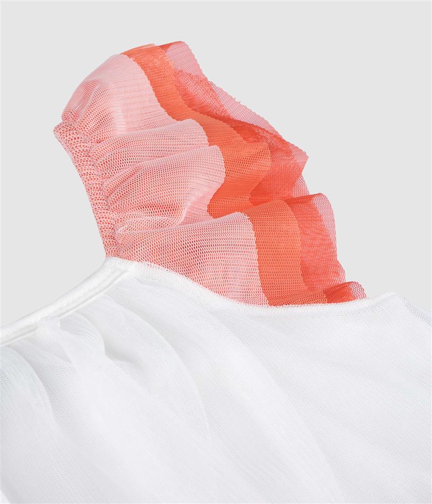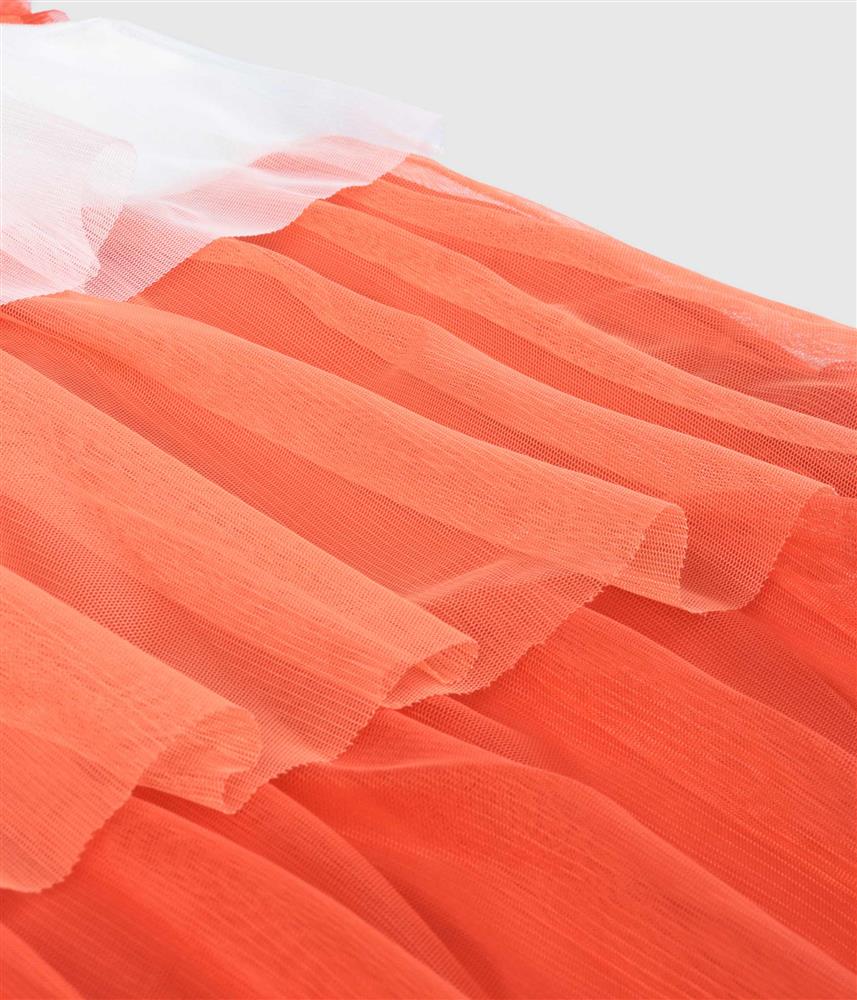 Modelo com efeito em camadas e combinação de cores suaves, que cria um visual delicado e elegante. As mangas com folho em tule acrescentam um toque romântico e encantador à peça.